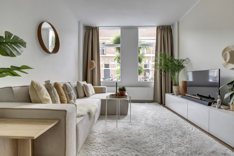 Je komt boven op een ruime en lichte overloop met een modern toilet. De ruime, brede woonkamer is opgedeeld in een voor- en achterkamer. De woonkamer aan de voorzijde heeft een mooi groot raam van waaruit je ver weg kijkt de Ternatestraat in. Er is ook nog een vaste kast.